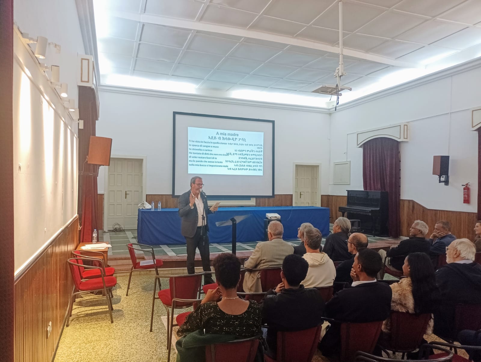 Durante l’evento, cui ha preso parte anche il Commissario alla Cultura e allo Sport Amb. Zemede Tekle, il prof. Pozzani ha declamato e commentato alcune poesie italiane dal Novecento fino ai giorni nostri (d’Annunzio, Marinetti, Campana, Pozzi, Pavese, Sbarbaro, Sanguineti e Merini). Il poeta ha tra l’altro recitato la sua poesia “A mia madre”, tradotta anche in Tigrinya per l’occasione.